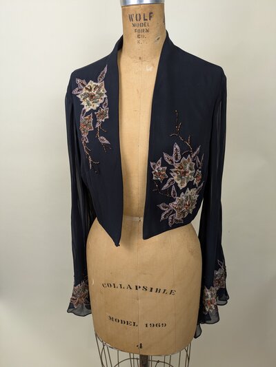 It's silk. It's heavily beaded with the most beautiful floral design. it's got bell sleeves. It'll make you feel your most fairy. We adore this Sue Wong bolero jacket, whose y2k nocturne collection has become something of a cult following in recent times.