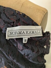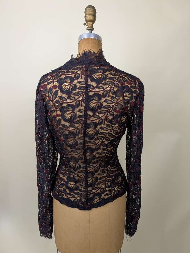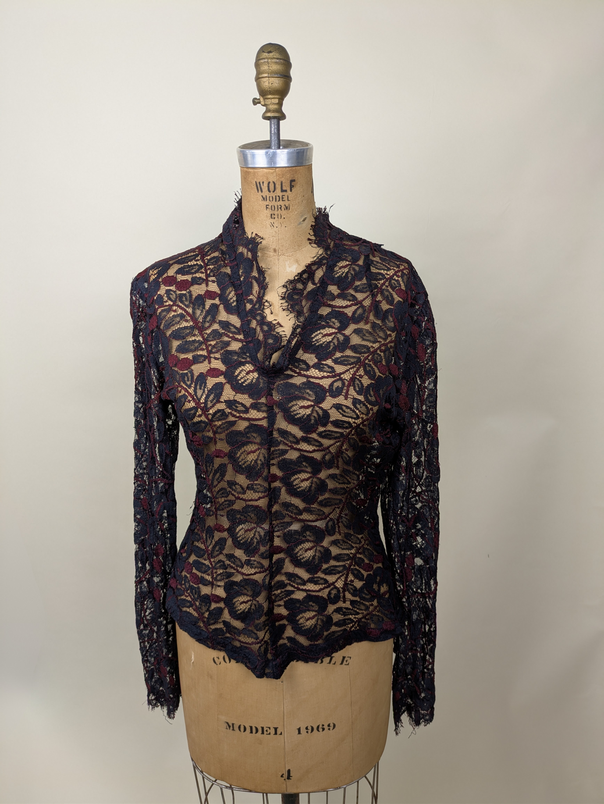 Channel your inner dark romantic with this delicious Norma Kamali red and black lace top. Side zip closure. It has a ruffled v neck which could be front at the front or back depending on desired neckline. Stunning raw edge and scalloped cuffs and neckline.