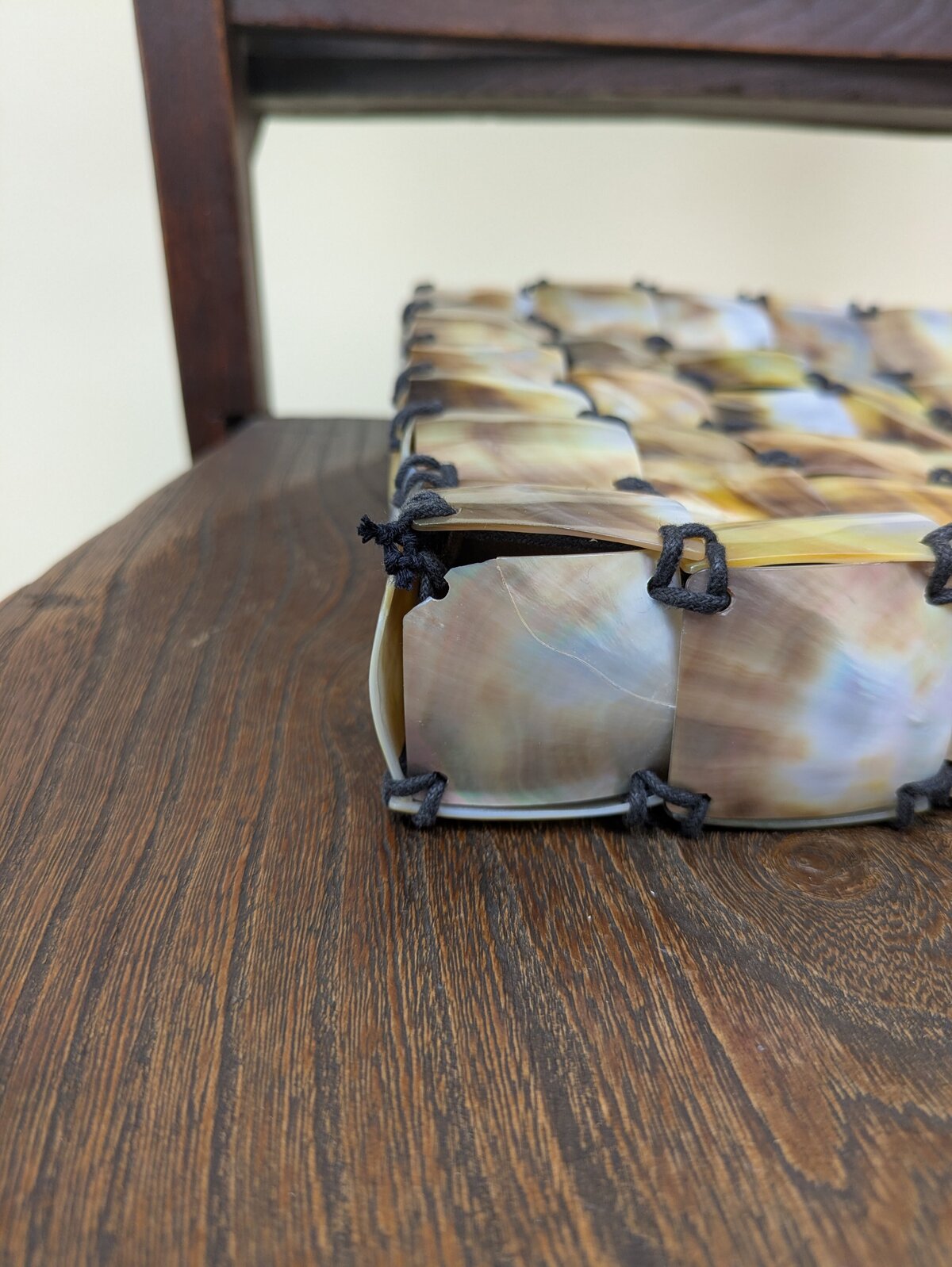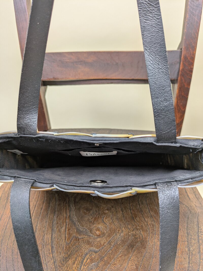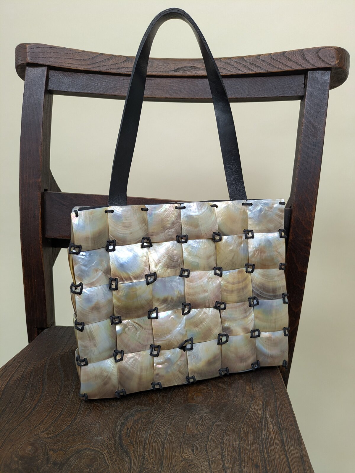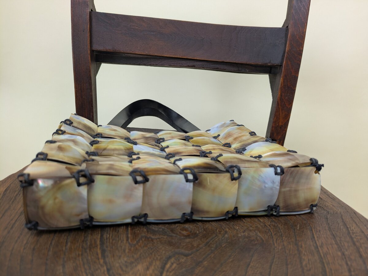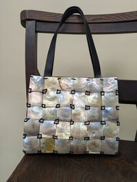 A stunning square little shoulder bag, adorned with squares of mother of pearl shell, stitched together to create an outer layer. Finished with leather straps. It has a magnetic closure. We love the way this bag captures the light.