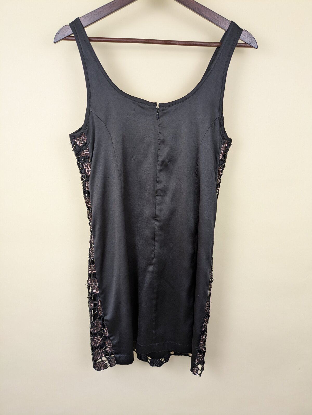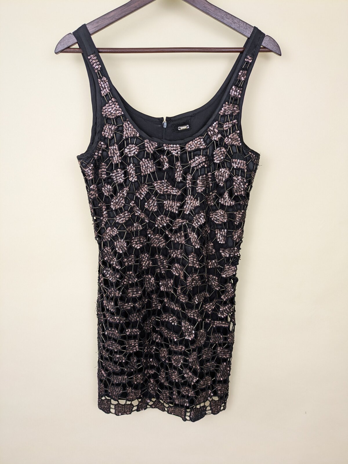 an incredible LBD from the 1990's when Guess was in their heydey. It's double layered, the top is embellished with rose gold and metal beading in an incredible pattern. This is the coolest little party dress. Back zip closure.