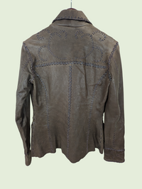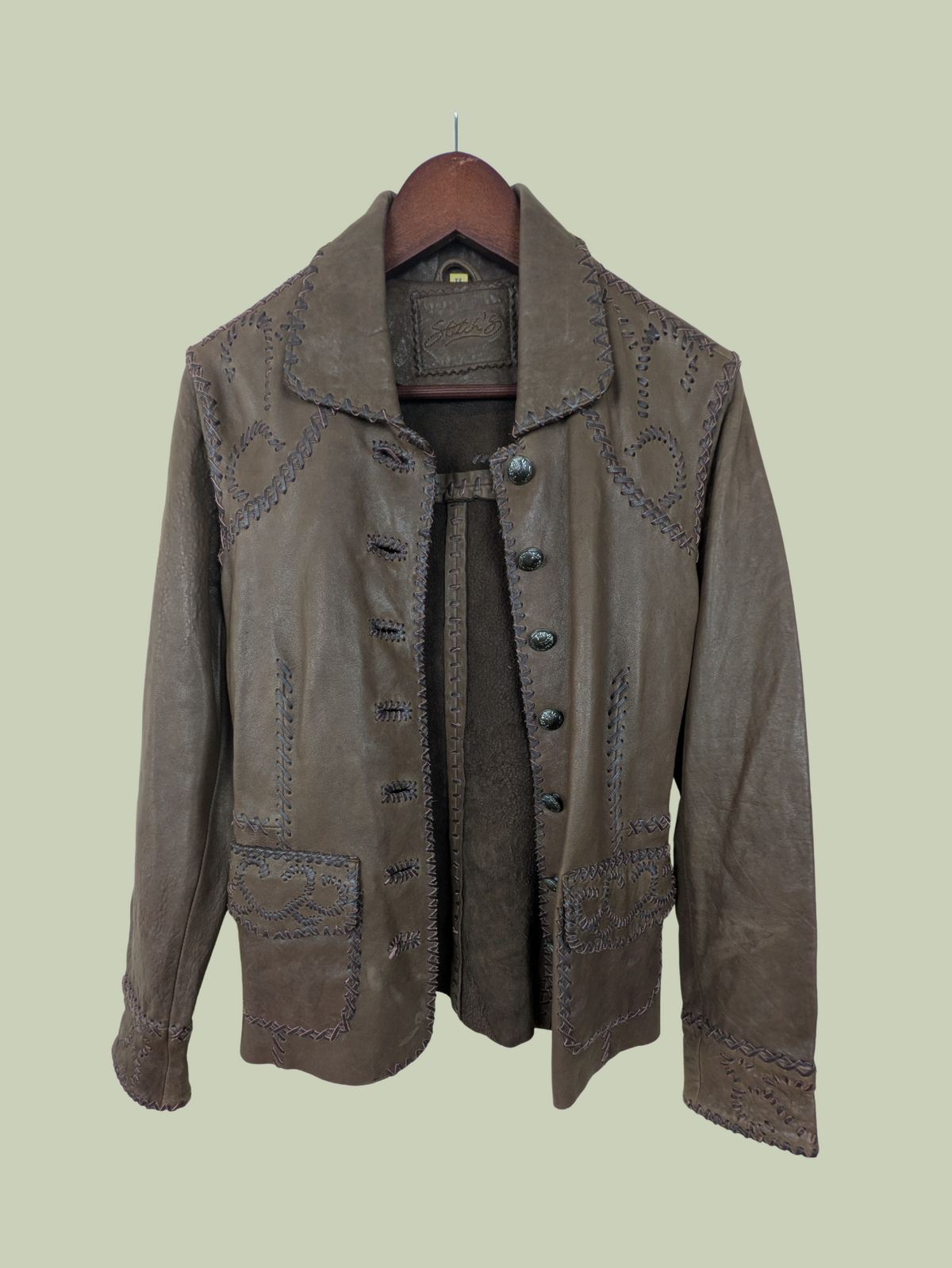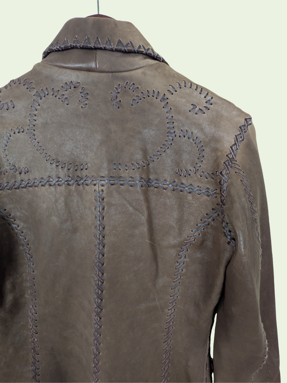 A butter soft brown leather jacket that has been lovingly stitched with leather cord along the seams, shoulders and pockets to accent and create interest and texture. It's absolutely amazing. A really special and unique piece. This would best fit a size small.