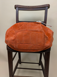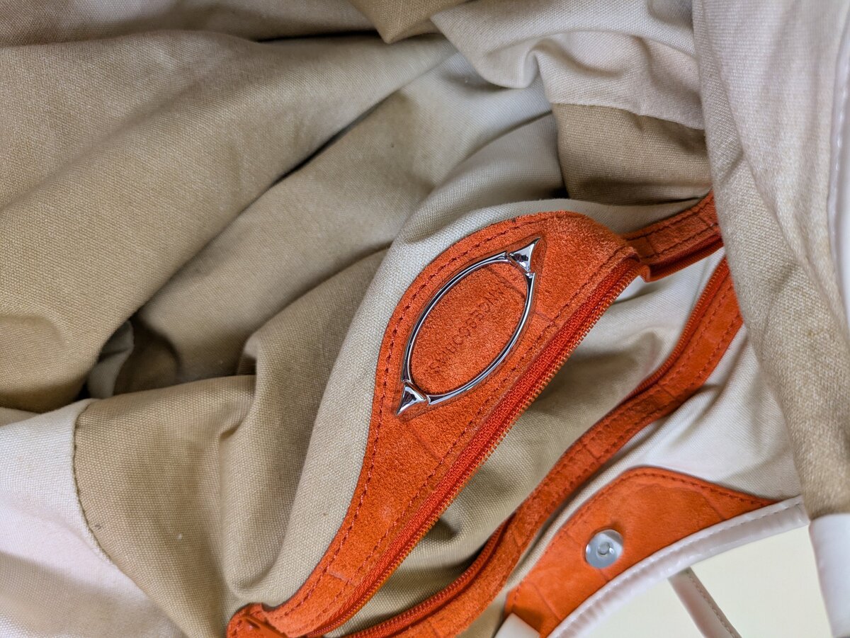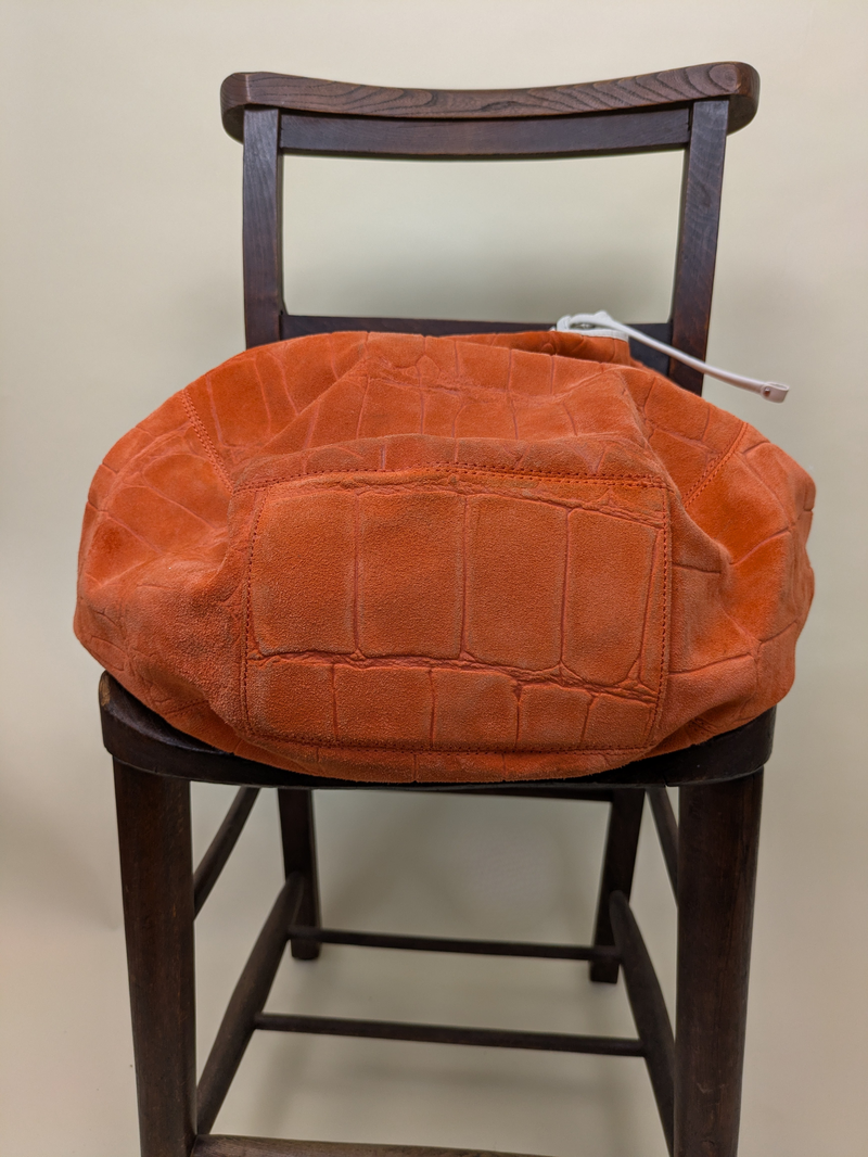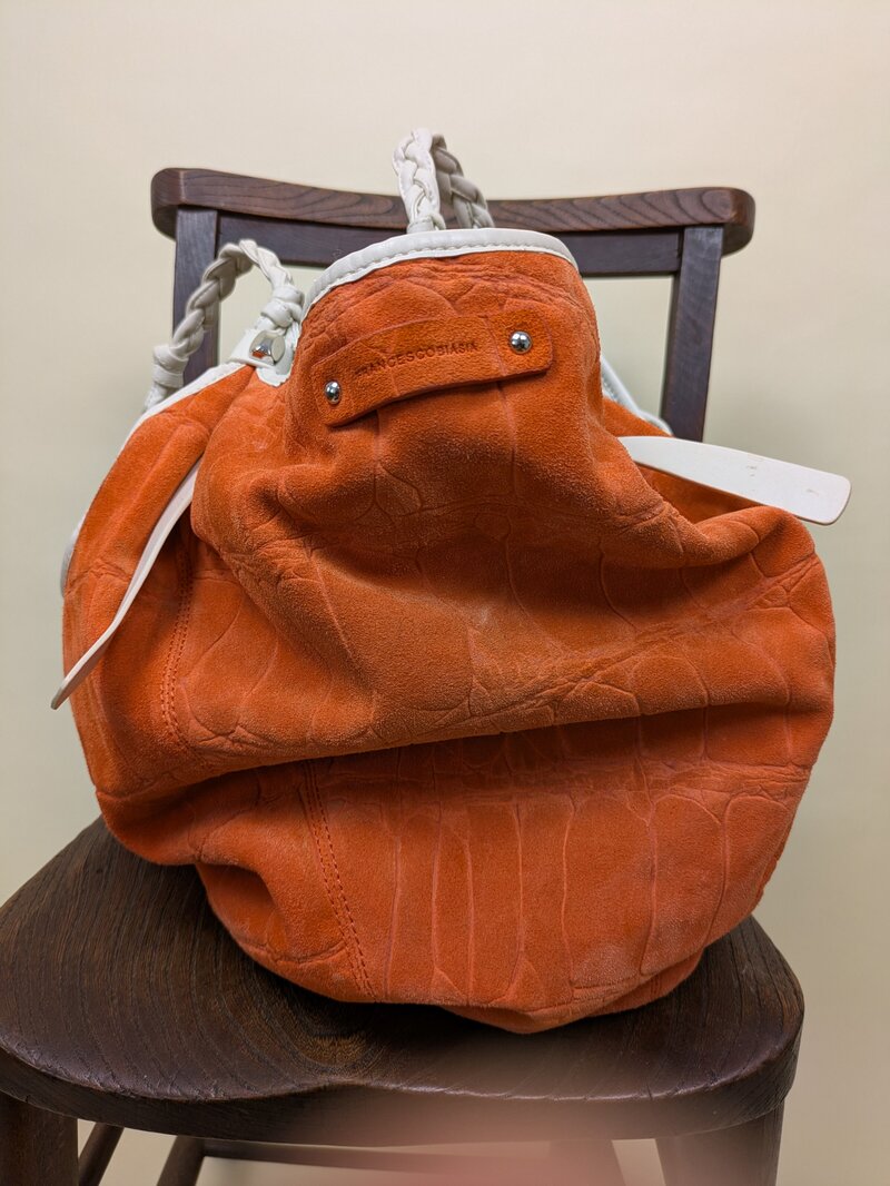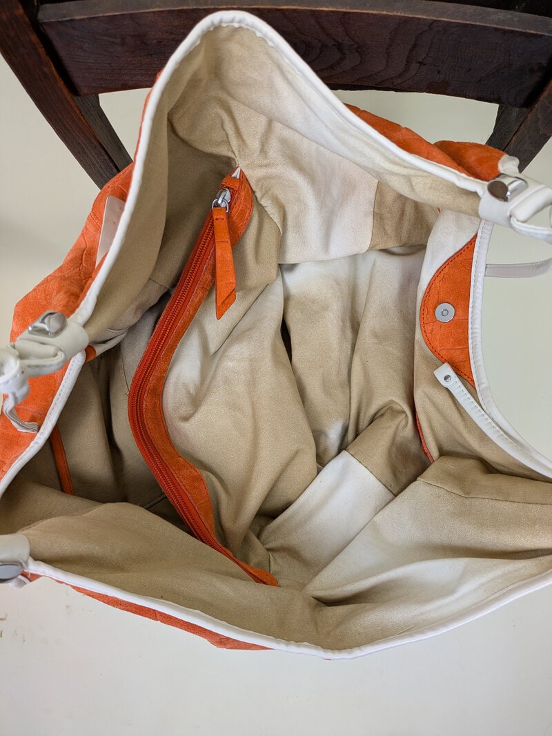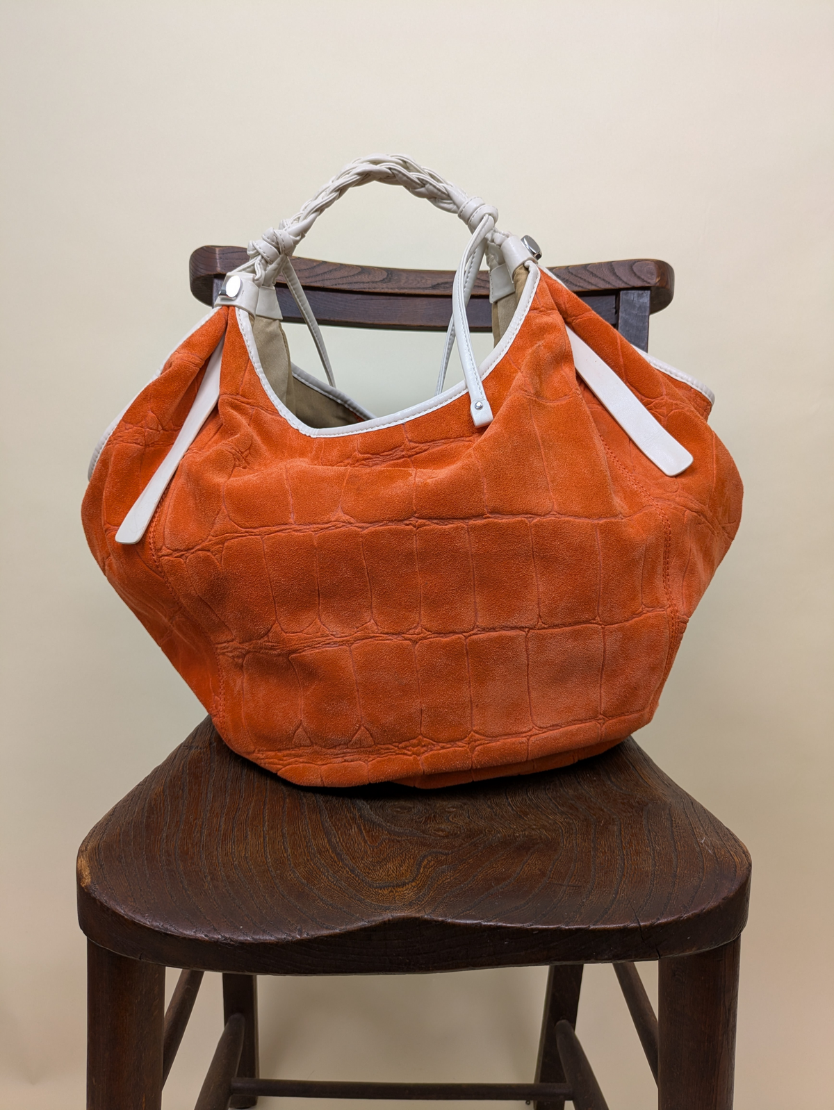 An incredible Francesco Biasia orange suede large hobo bag with white leather trim and woven handles. Add a pop of colour to your outfit with this merry orange that'll work for autumn and summer alike.
