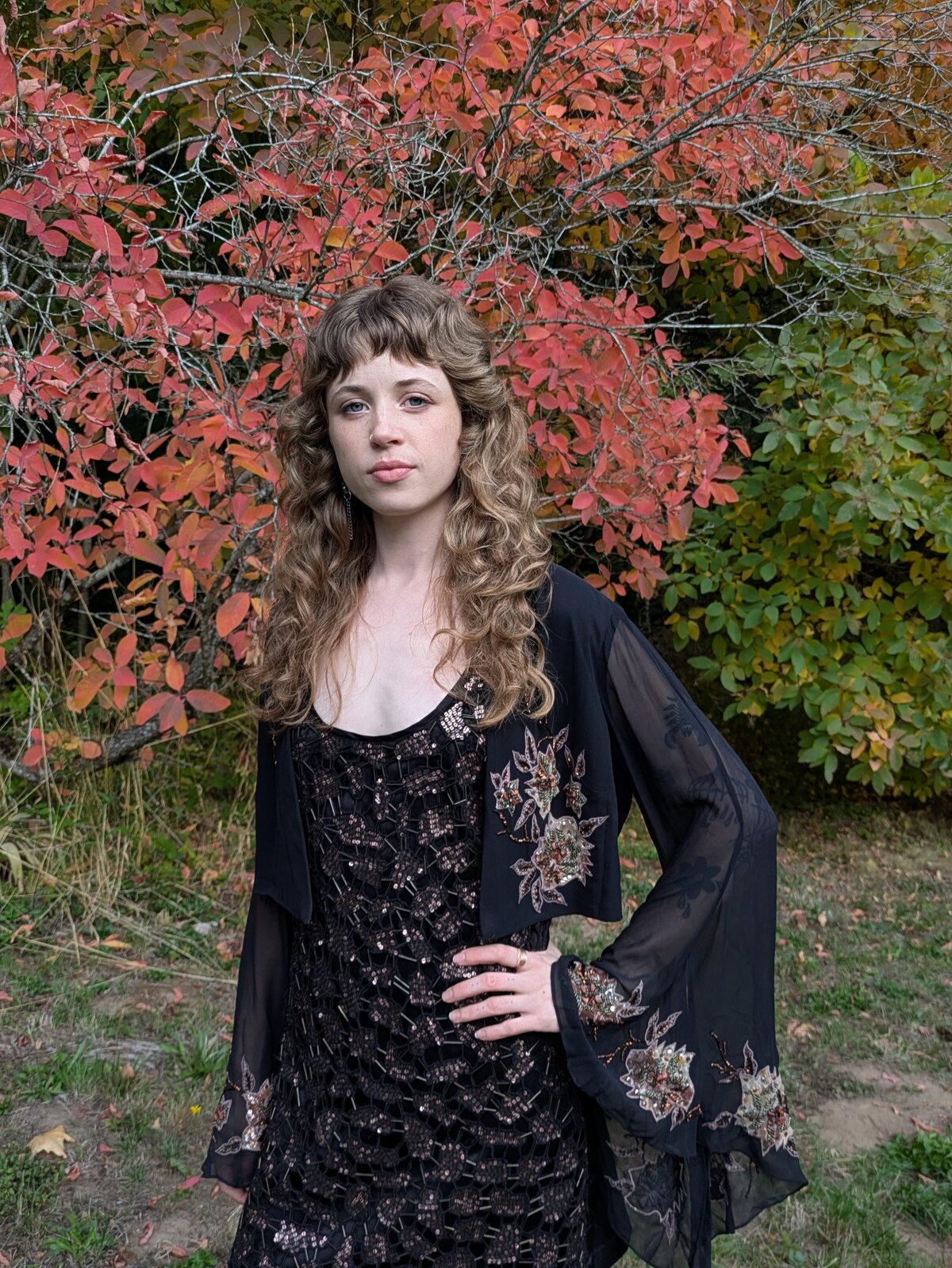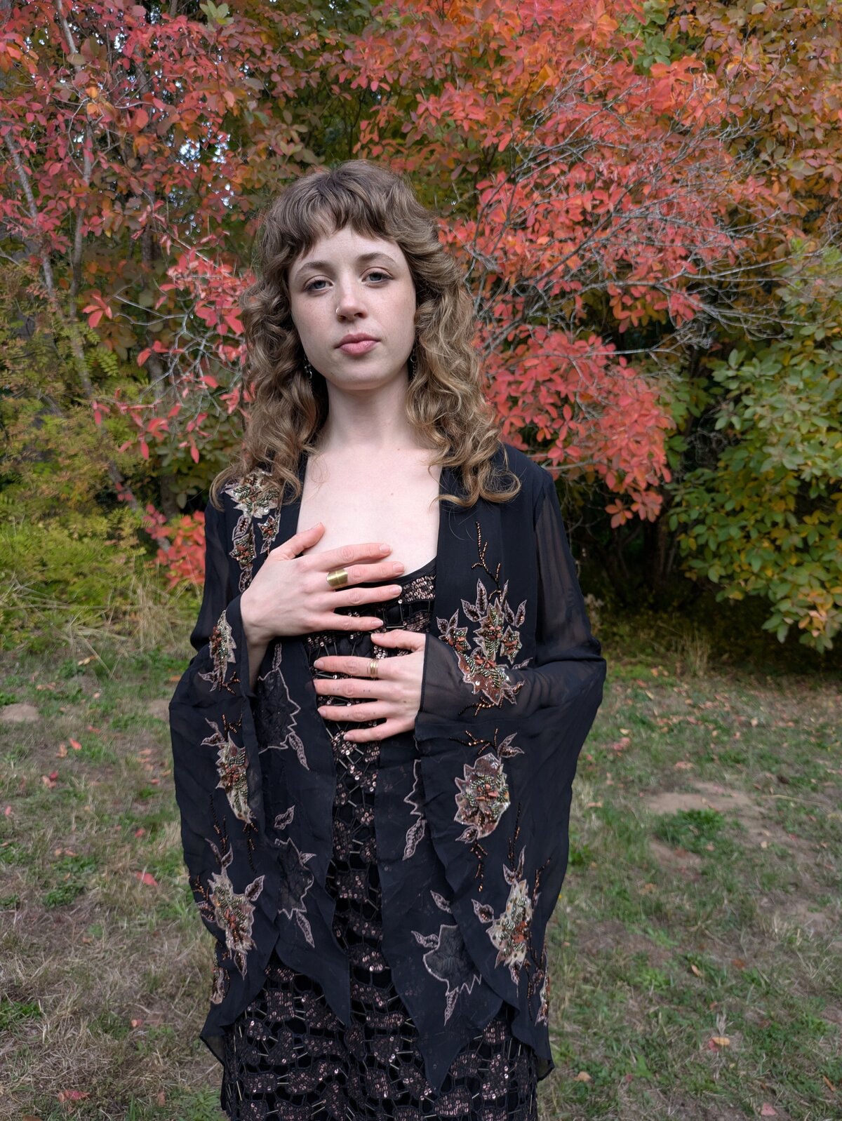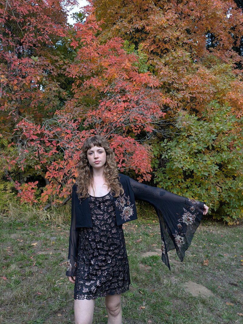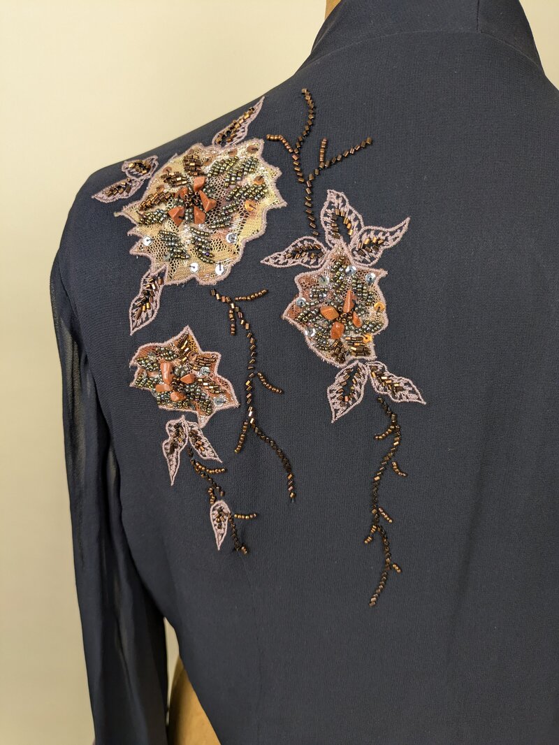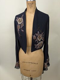 Unleash your inner whismigoth with this deliciously and darkly romantic Sue Wong nocturne fairy bolero jacket. The Sue Wong nocturne collection has gained a cult following in recent times and it's because the design and quality is impeccable. Featuring heavy floral beading in fall colour and bell sleeves in lashings of sheer silk. It's utterly amazing.