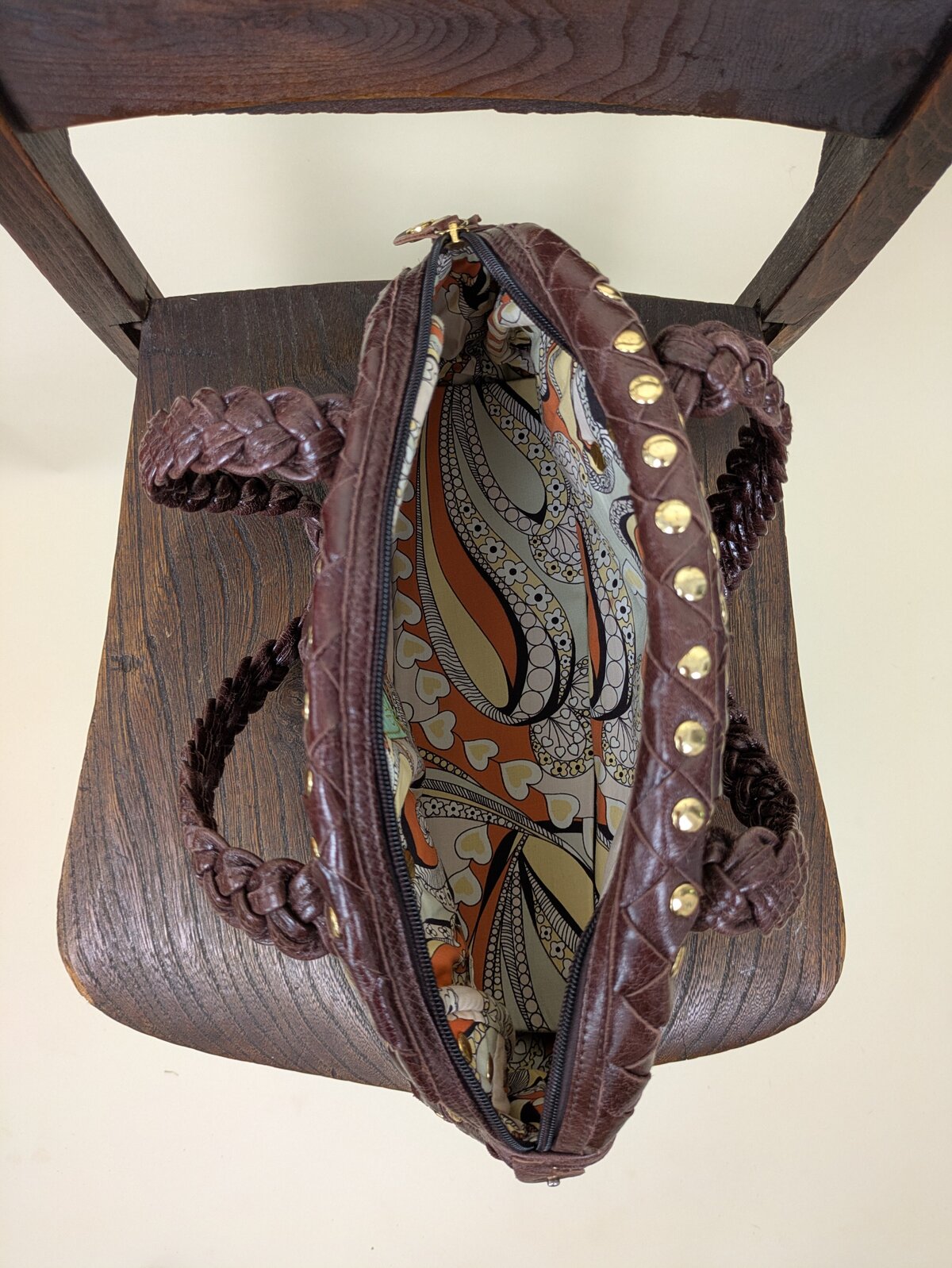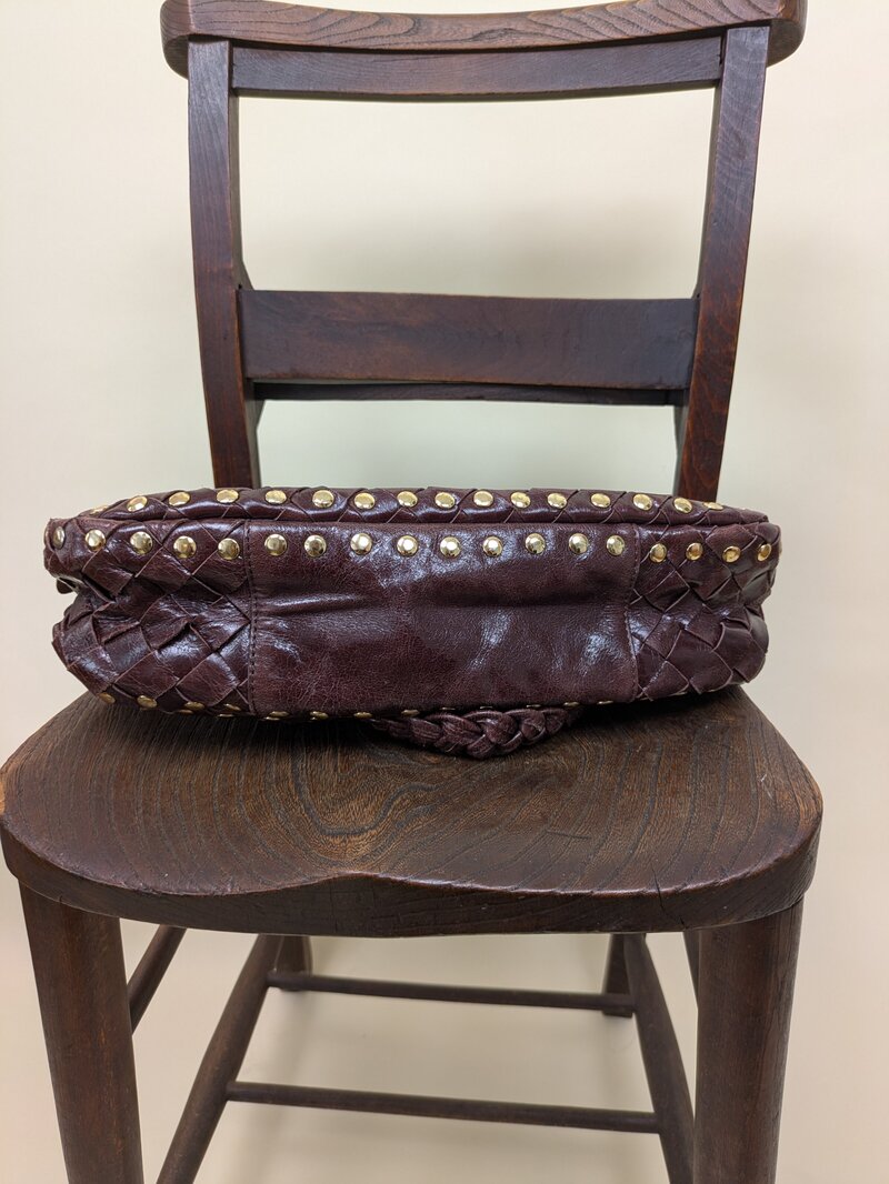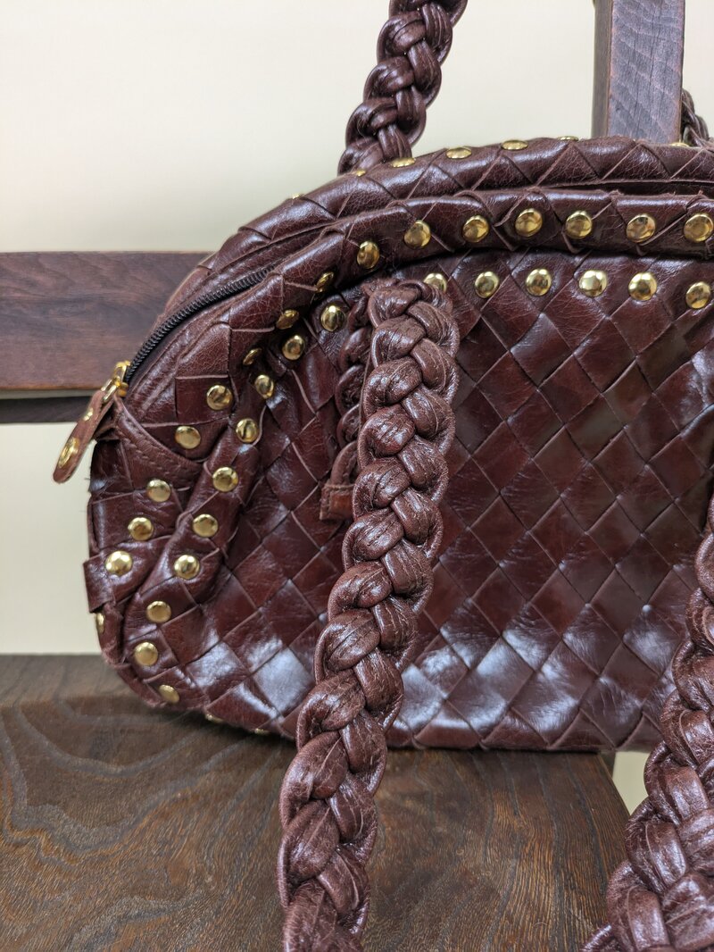 The bowling bowl bag was a wardrobe staple back then and we think the craftsmanship of this bag makes it a timeless piece that you'll reach for again and again. Made from woven brown leather and finished with gold studs and hardware. It's fully lined and has a zip through closure. She's ready to be worn and adored again.