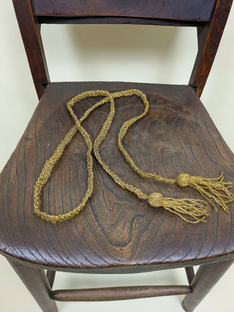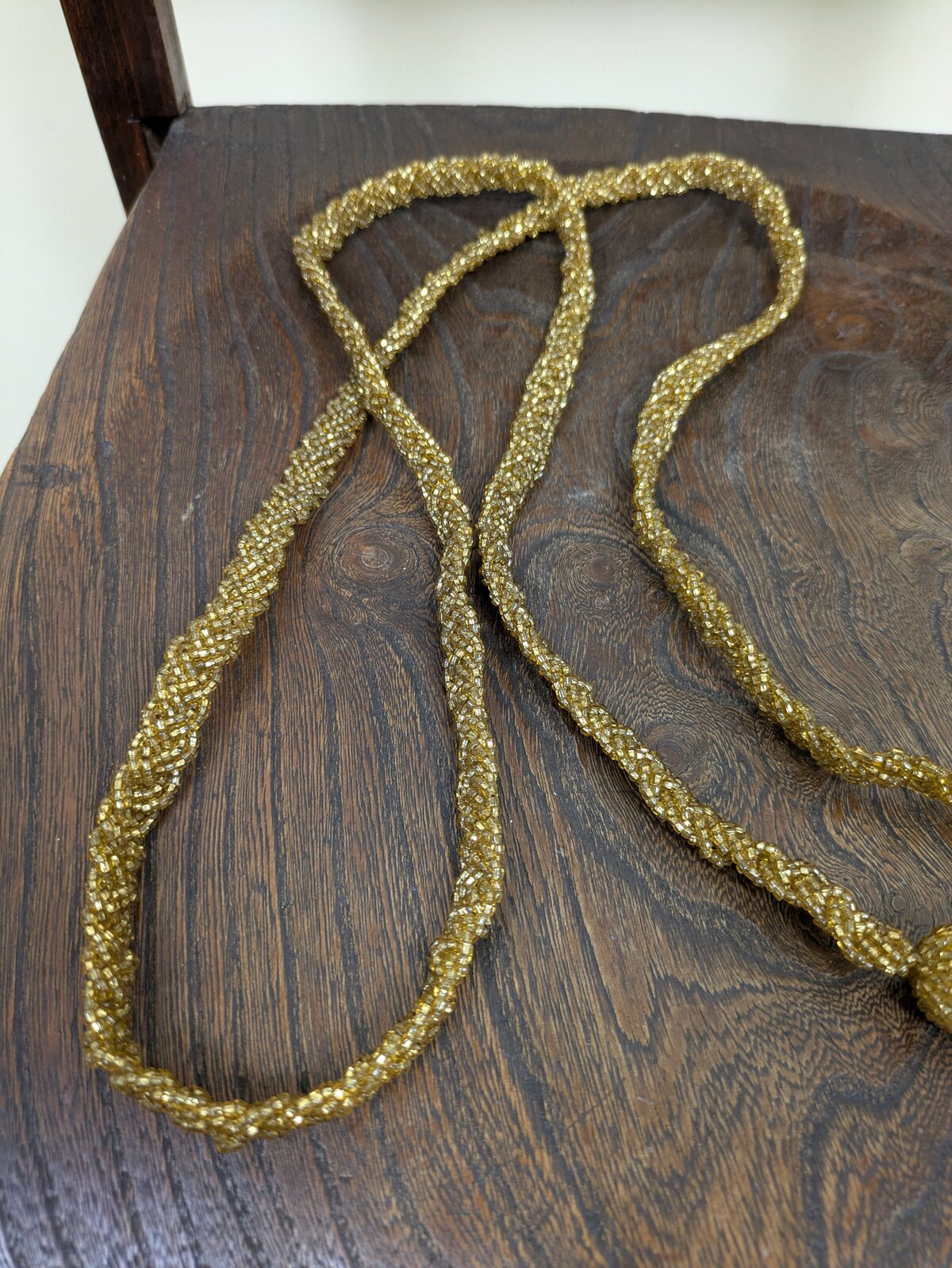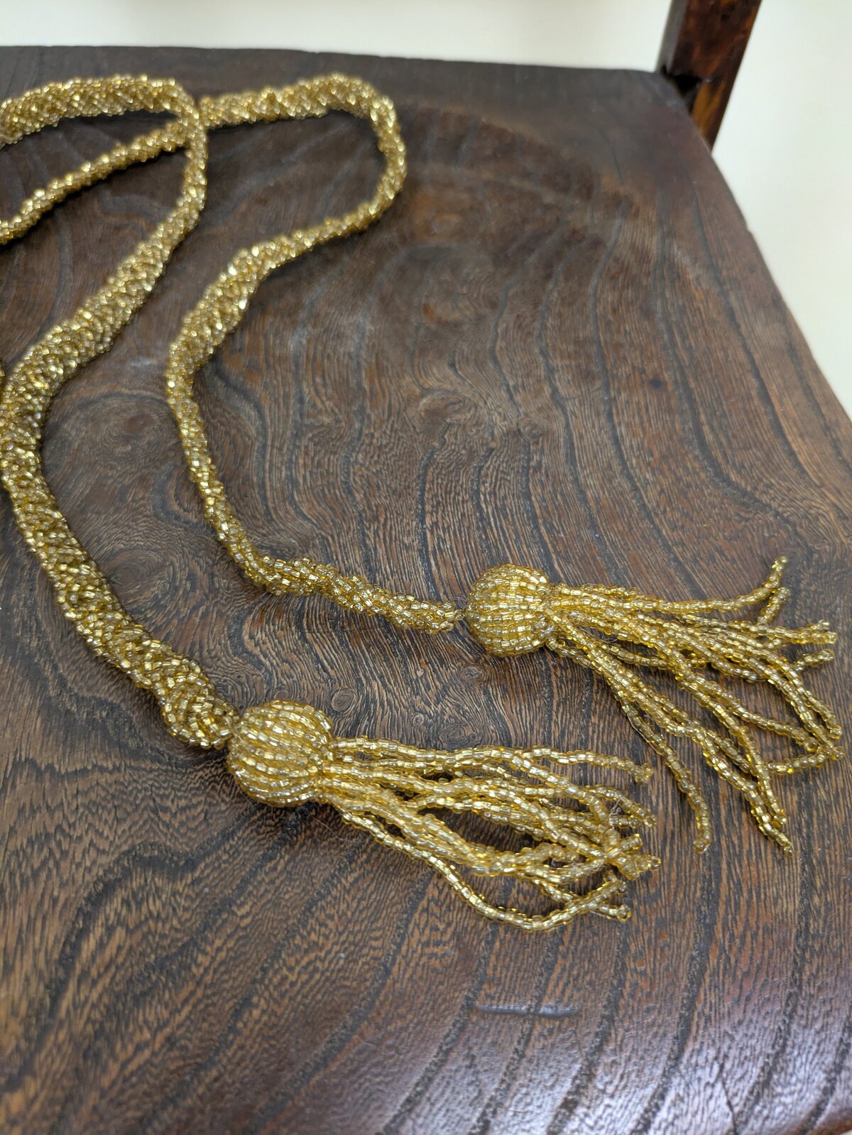 An incredible yellowy gold glass beaded flapper lariat tassel necklace dating all the way back to the 1920's/30's. In great condition considering it's age. We love the energy of this piece. She's ready to be worn again.